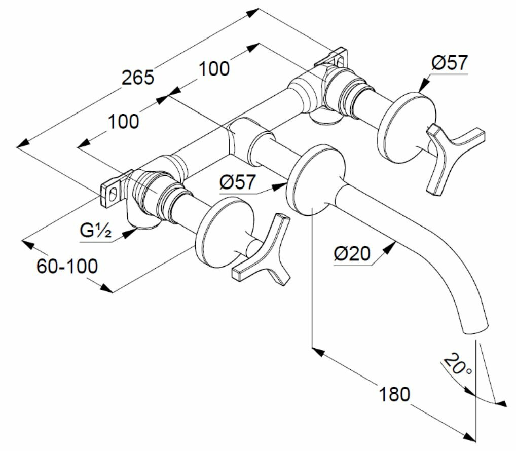 Встраиваемый в стену смеситель для раковины Kludi Nova Fonte, арт. 201440539, на 3 отв., рукоятки Déco, излив 18 см