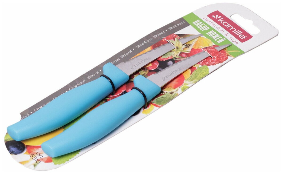 Ножи кухонные 2 предмета из нержавеющей стали Kamille КМ 5310 (лезвие 8 см, рукоятка 11 см) с пластиковыми ручками (144/36 / голубой)