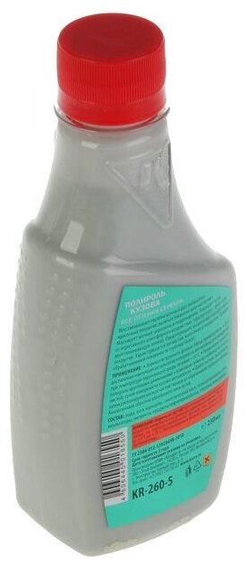 | Способ применения | хорошо встряхнуть флакон перед применением; для достижения наилучших результатов полировать автомобиль рекомендуется при температуре окружающей среды не ниже +10 °С; равномерно нанести полироль круговыми движениями с помощью губки на небольшой участок чистой, сухой поверхности кузова автомобиля; дать составу подсохнуть, затем располировать мягкой чистой тканью до образования глубокого блеска; аналогичным образом обработать весь кузов |