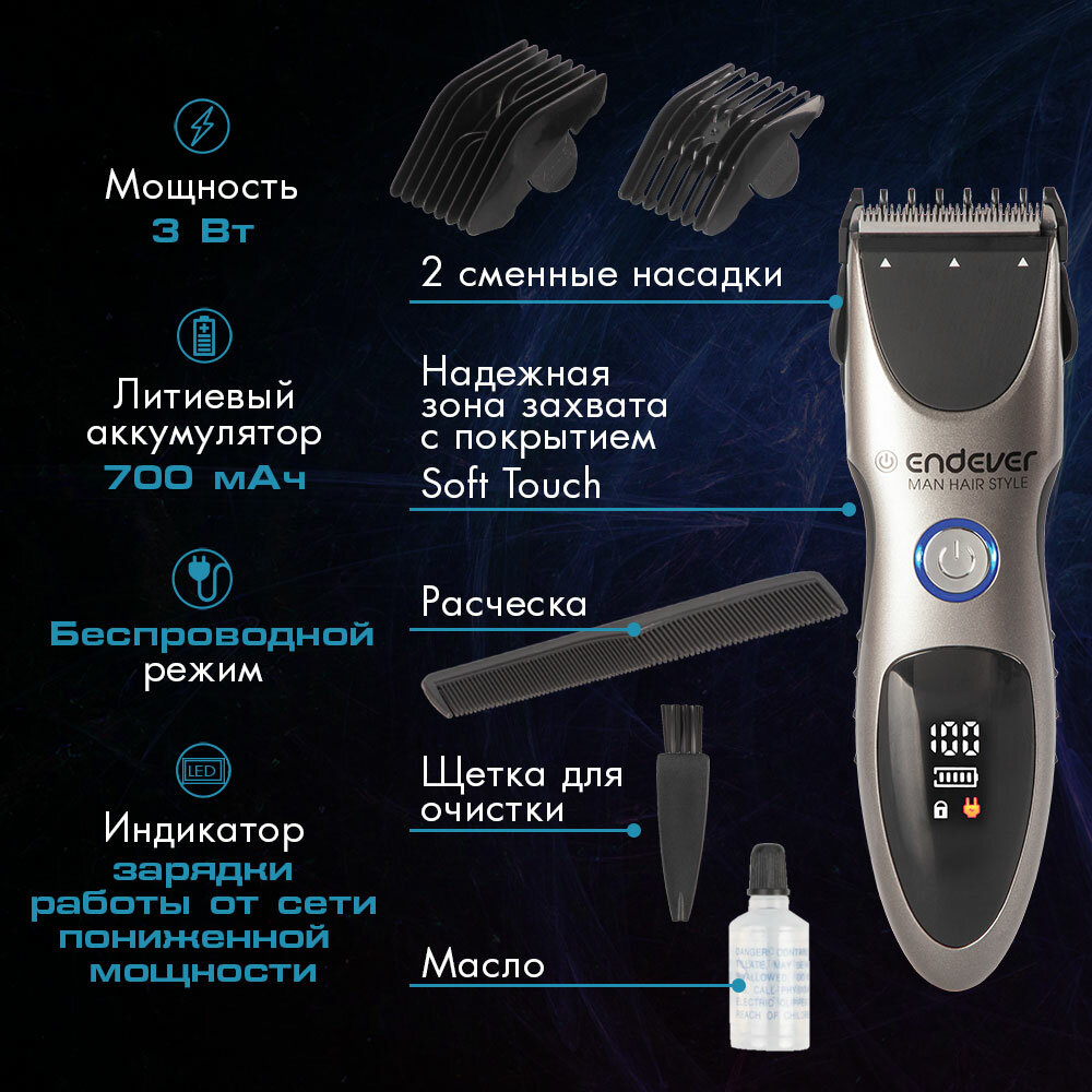 Машинка для стрижки волос и бороды беспроводная Endever Sven-985 / 2 сменные насадки 3/6/9/12 мм / мощный AC мотор 3 Вт