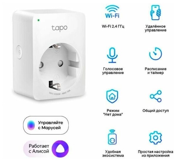Tapo P100(1-pack) Tapo умная мини-розетка P100, 220–240 В, 50/60 Гц, стандарты Wi-Fi 802.11b/g/n, вс