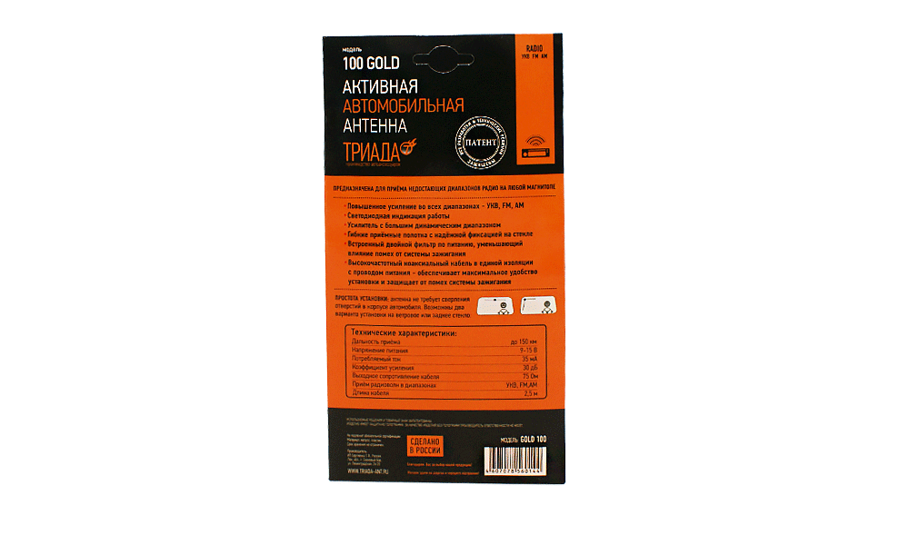 Антенны автомобильные Триада Антенна автомобильная активная Триада-100 GOLD на спец. помехозащ. микросхеме информация: