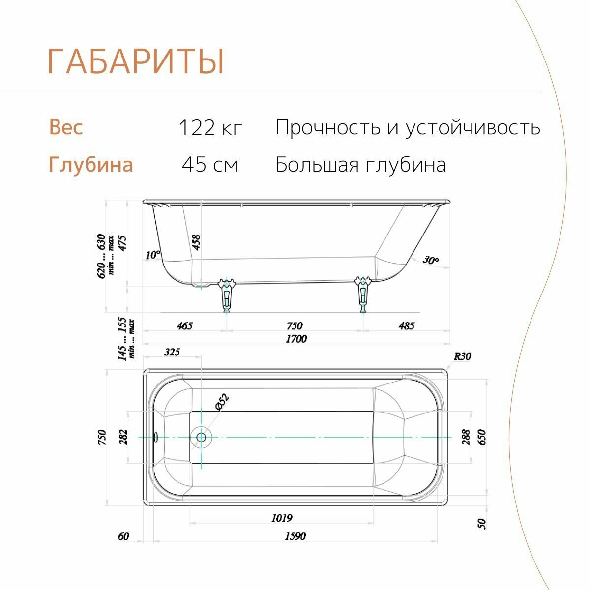 Ванна чугунная tempra Simple 170x75 круглые ручки информация: