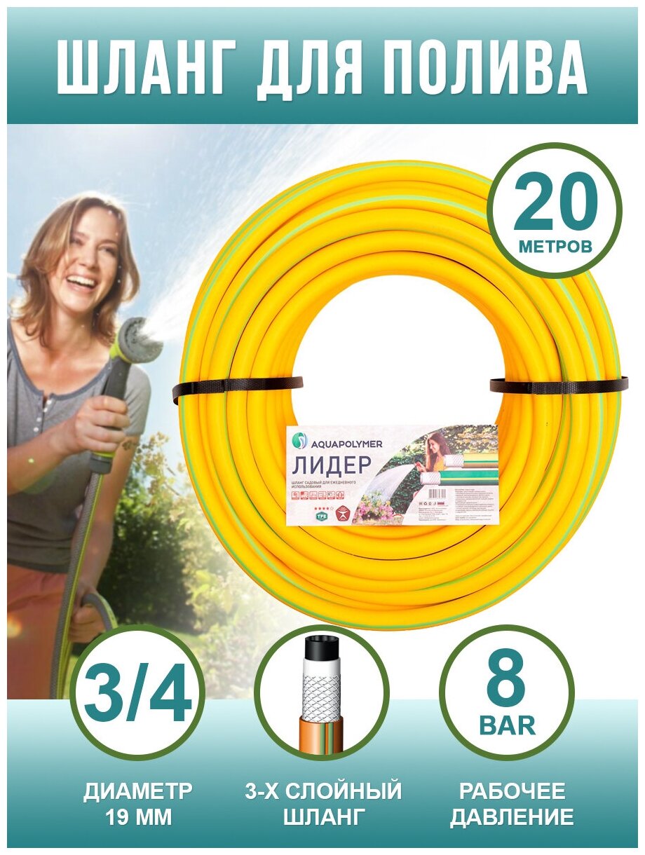 | Комплектация | Шланг поливочный трёхслойный армированный морозостойкий Аквапульс ТЭП ЛИДЕР 3/4 20м желтый - 1шт |