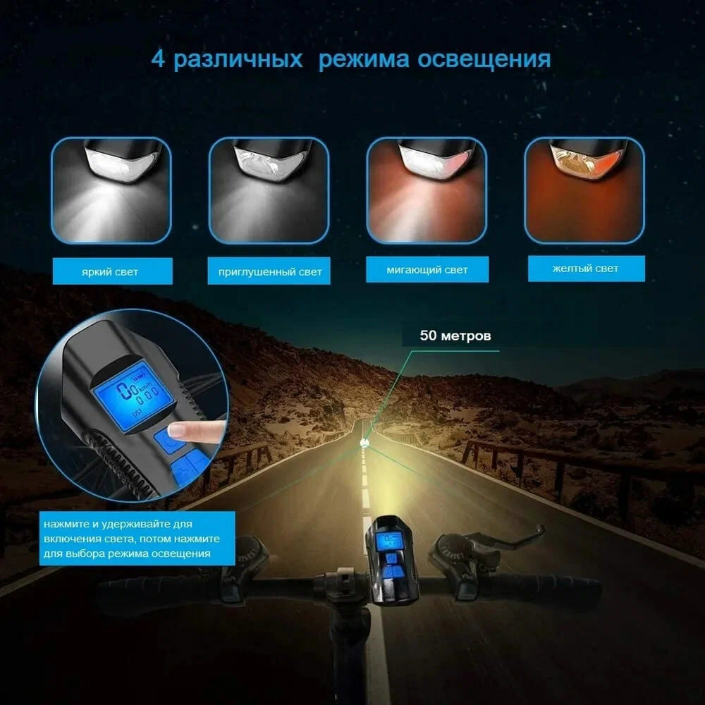 Аккумуляторный светодиодный фонарь для велосипеда с гудком, спидометром и зарядкой USB от GadFamily_Shop 1 200 ₽