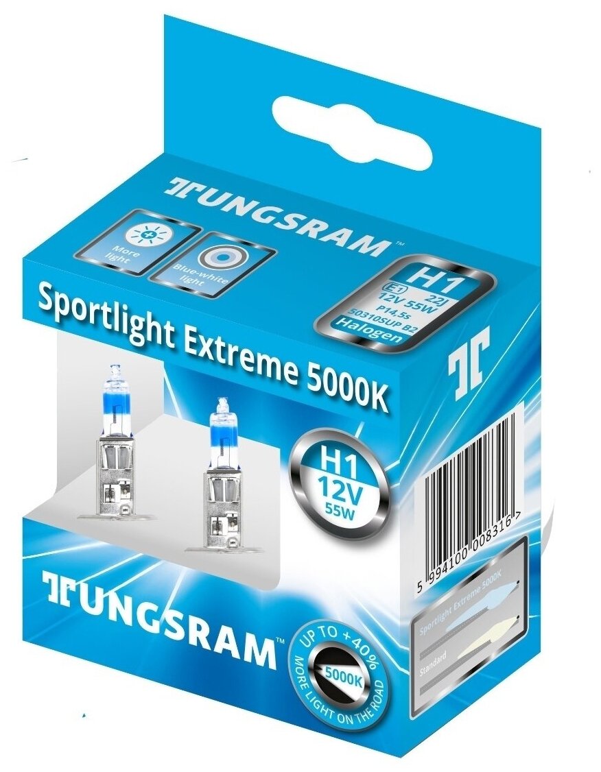 Лампы TUNGSRAM "Sportlight Extreme", H1, +40%, 12V, 55W, P14,5s, 5000K, комплект 2 шт. информация: