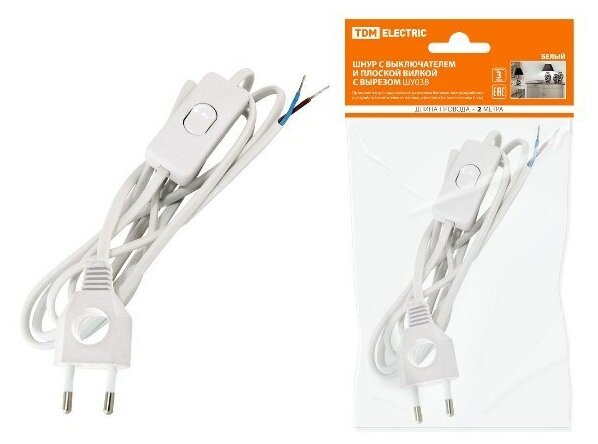 Отзывы на Шнур с выключателем и плоской вилкой с вырезом ШУ03В ШВВП 2х0,75мм2 2 м. белый TDM