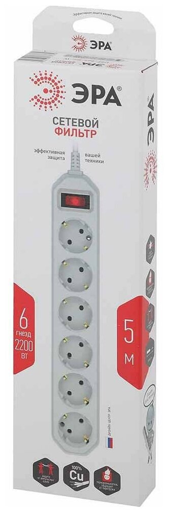 Отзывы на Сетевой фильтр ЭРА USF-6es-5m-W-BOX с заземлением с защитой с выключ 6 розеток 5 м белый