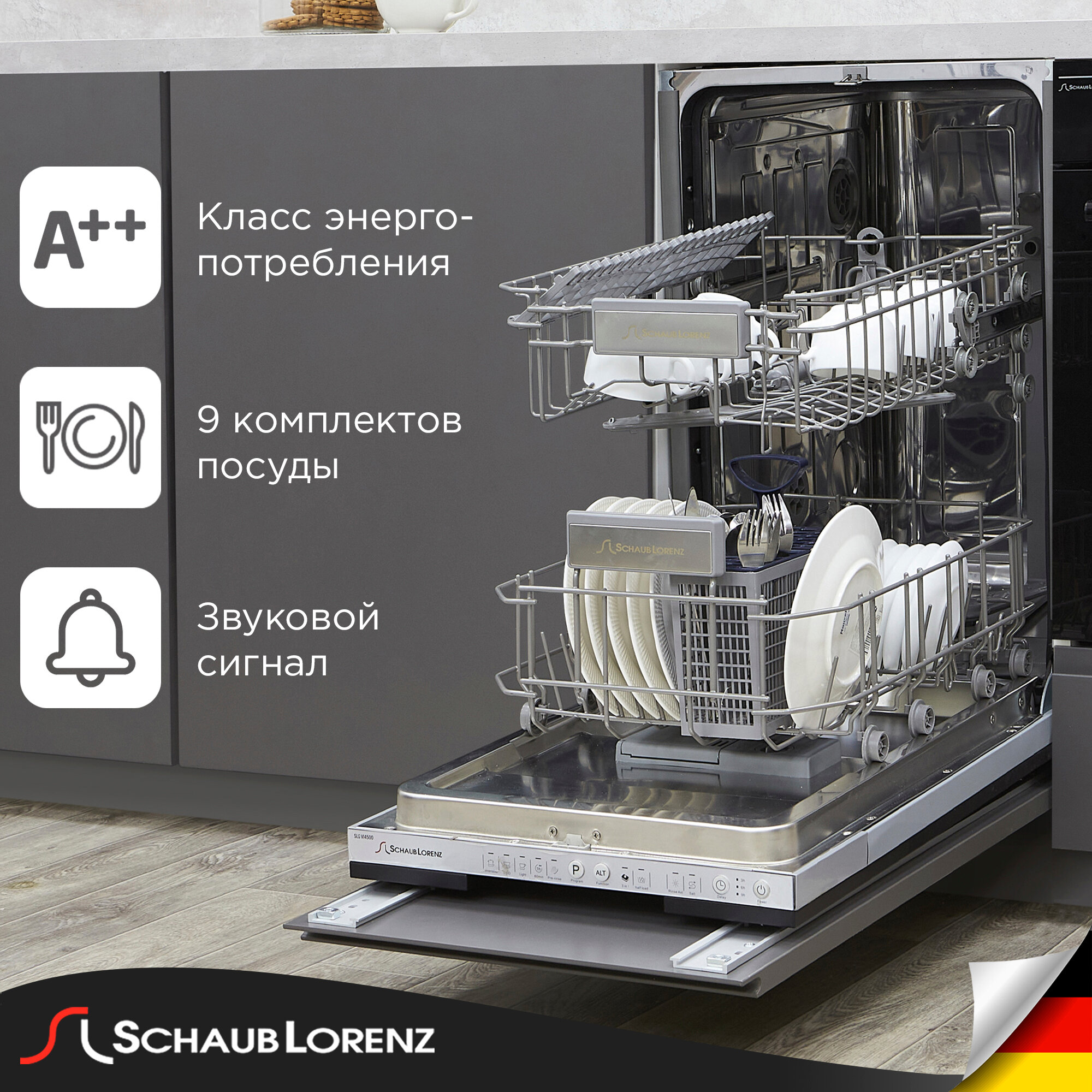 Встраиваемая посудомоечная машина Schaub Lorenz Ширина 45 см, Загрузка 9 комплектов посуды, 5 программ, Защита от перелива воды, Уровень шума 49 дБА, А++; Габаритные размеры (ВхШхГ), мм: 815х448х558