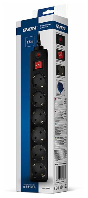 Сетевой фильтр SVEN Optima 6 розеток, 1,8 метра, черный (220V/10A/термопредохранитель) информация: