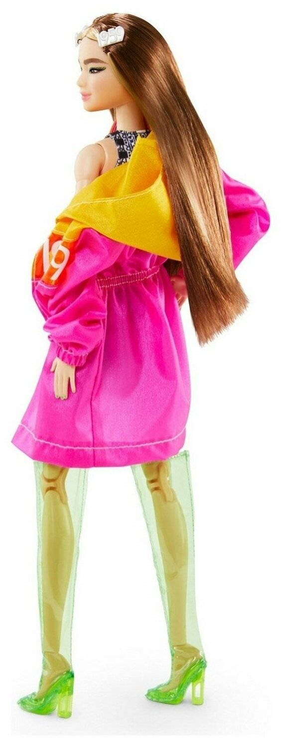 | Дополнительная информация | Кукла одета в стиле 90-х. Ее образ дополняют яркий макияж, зеленый маникюр и прозрачные неоновые сапоги на высоком каблуке. В комплекте представлена подставка для демонстрации куклы Барби. Дизайн упаковки напоминает обувную коробку. Габариты упаковки 36см x 15см x 7см. |