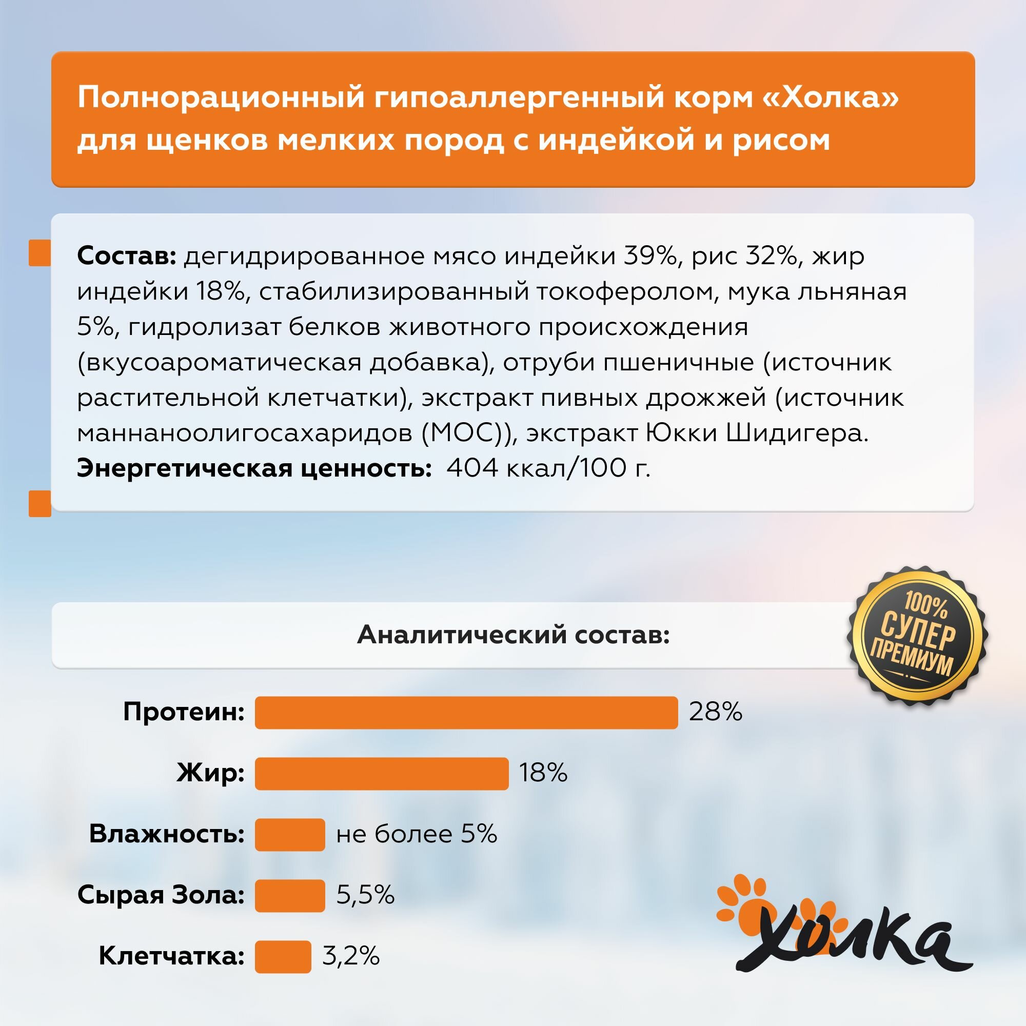 Корм холка гипоаллергенный премиум класса для щенков собак мелких пород с индейкой и рисом, 750 гр.