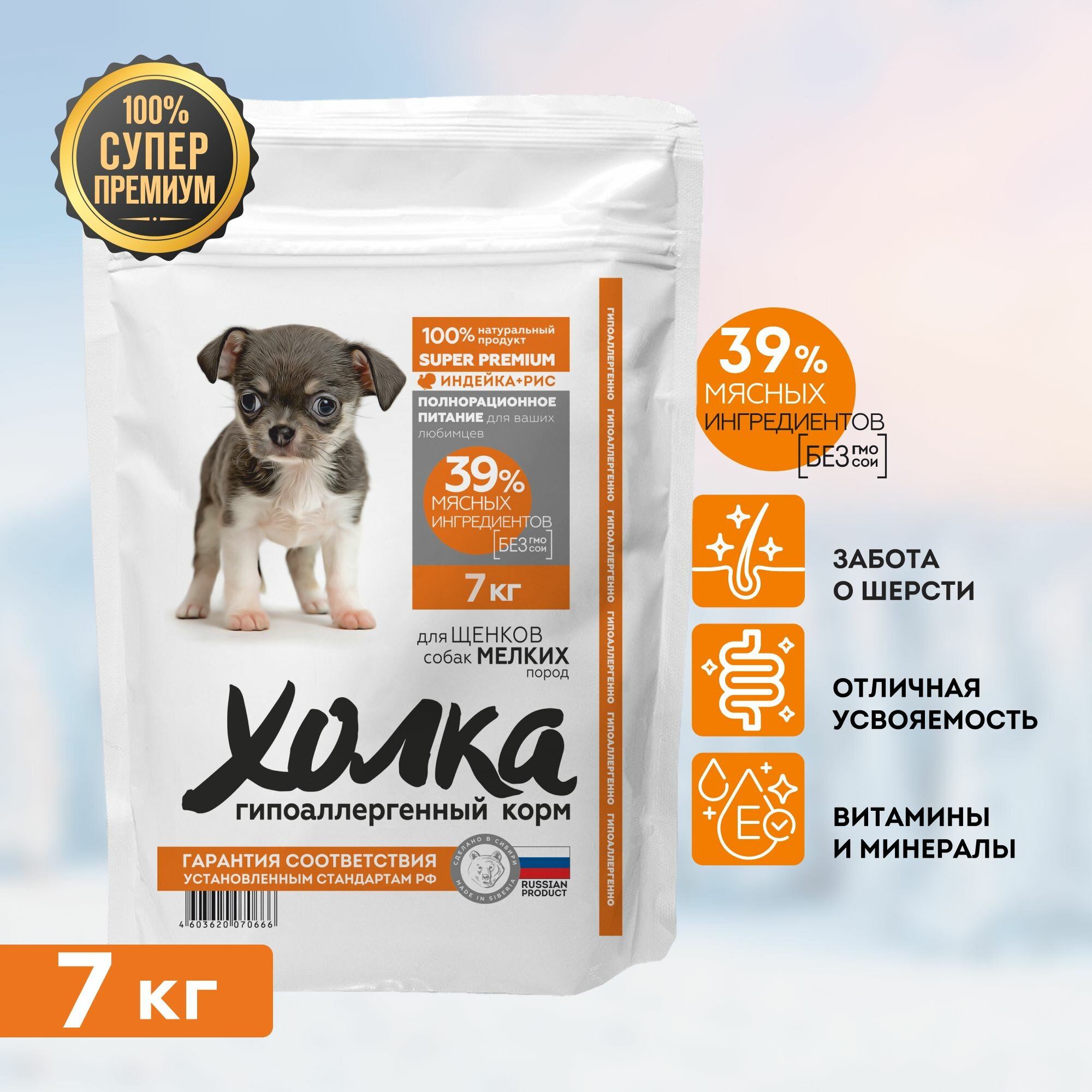 Гипоаллергенный полнорационный корм "Холка" для щенков собак мелких пород (39% мяса) из индейки и риса 15 кг