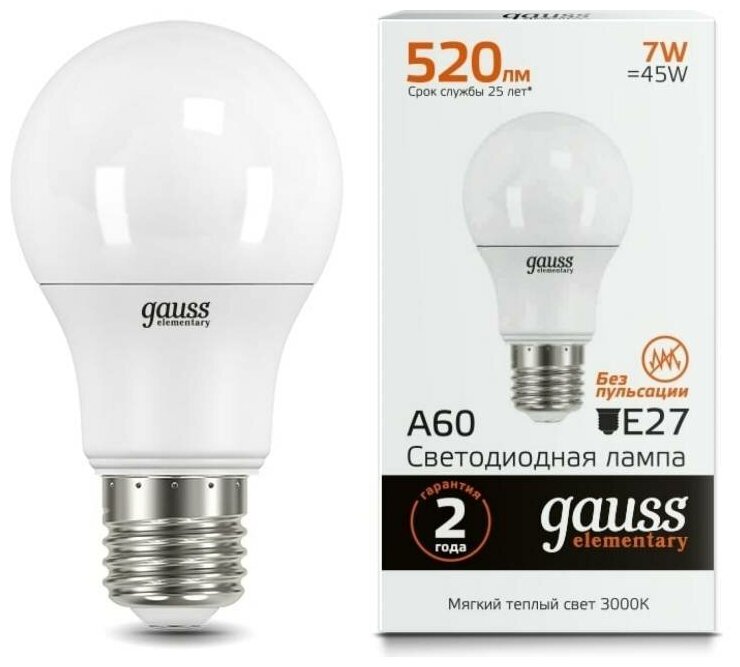 Отзывы на Лампа светодиодная Elementary 7Вт A60 грушевидная 3000К тепл. бел. E27 520лм GAUSS 23217A