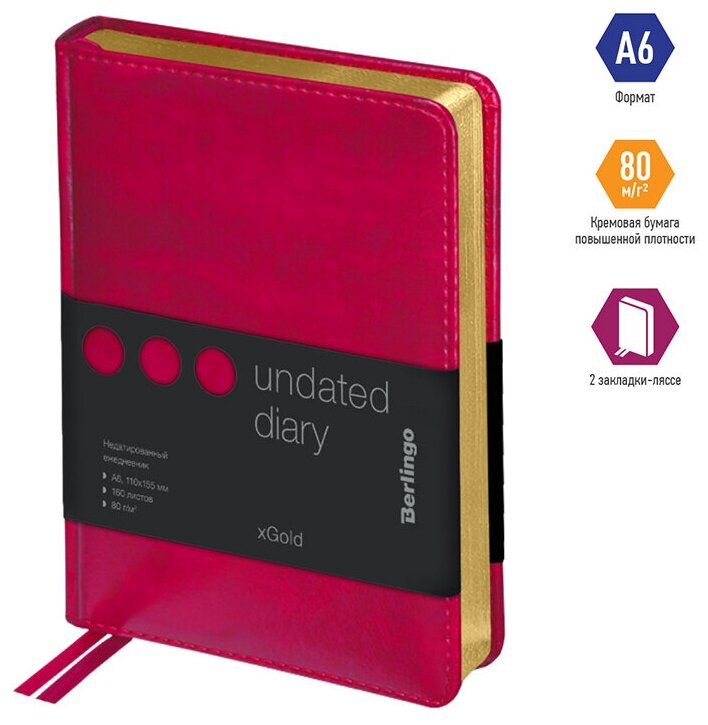 Ежедневник недатированный Berlingo A6, 160 листов, кожзам, "xGold", золотой срез, фуксия (UD0_81608)