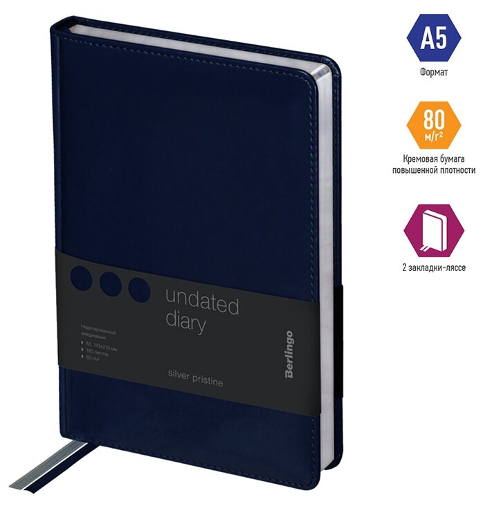 Ежедневник недатированный Berlingo A5, 160 листов, кожзам, "Silver Pristine", серебряный срез, синий (UD0_82503) 865 ₽