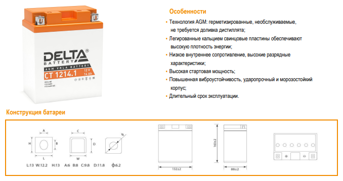 Аккумулятор мотоциклетный Delta CT1214.1 YB14-BS 12V 14Ah AGM(залит и готов к применению) информация: