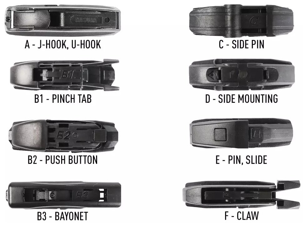 | Тип крепления | боковое крепление (Side Mounting) / боковой зажим (pinch tab) / боковой штырь (side pin) / клешня (claw) / кнопка (push button) / крючок (hook) / штыковой замок (bayonet) / штырь (pin lock) |