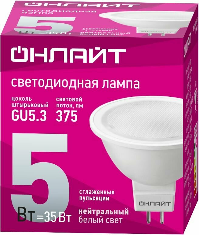 Лампа светодиодная LED Онлайт, GU5.3, MR16, 5 Вт, 4000 K, холодный свет 71 ₽