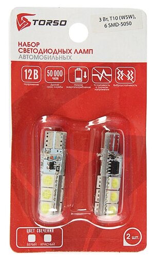 Cartage Автолампа светодиодная TORSO FLASH T10 W5W, габарит, 12 В, 3 Вт, 6 SMD-5050, 2 шт
