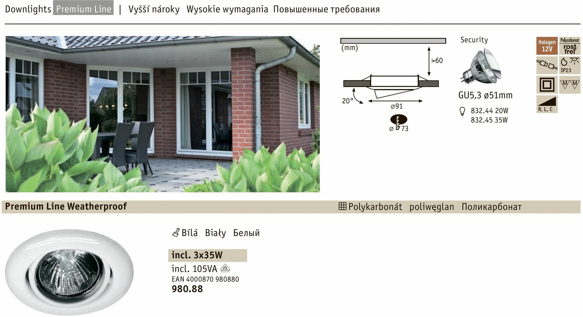 Светильник встраиваемый Paulmnn Premium Line Weatherproof D91 35Вт GU5.3 IP23 230/12В Белый Набор 3 штуки 98088 информация: