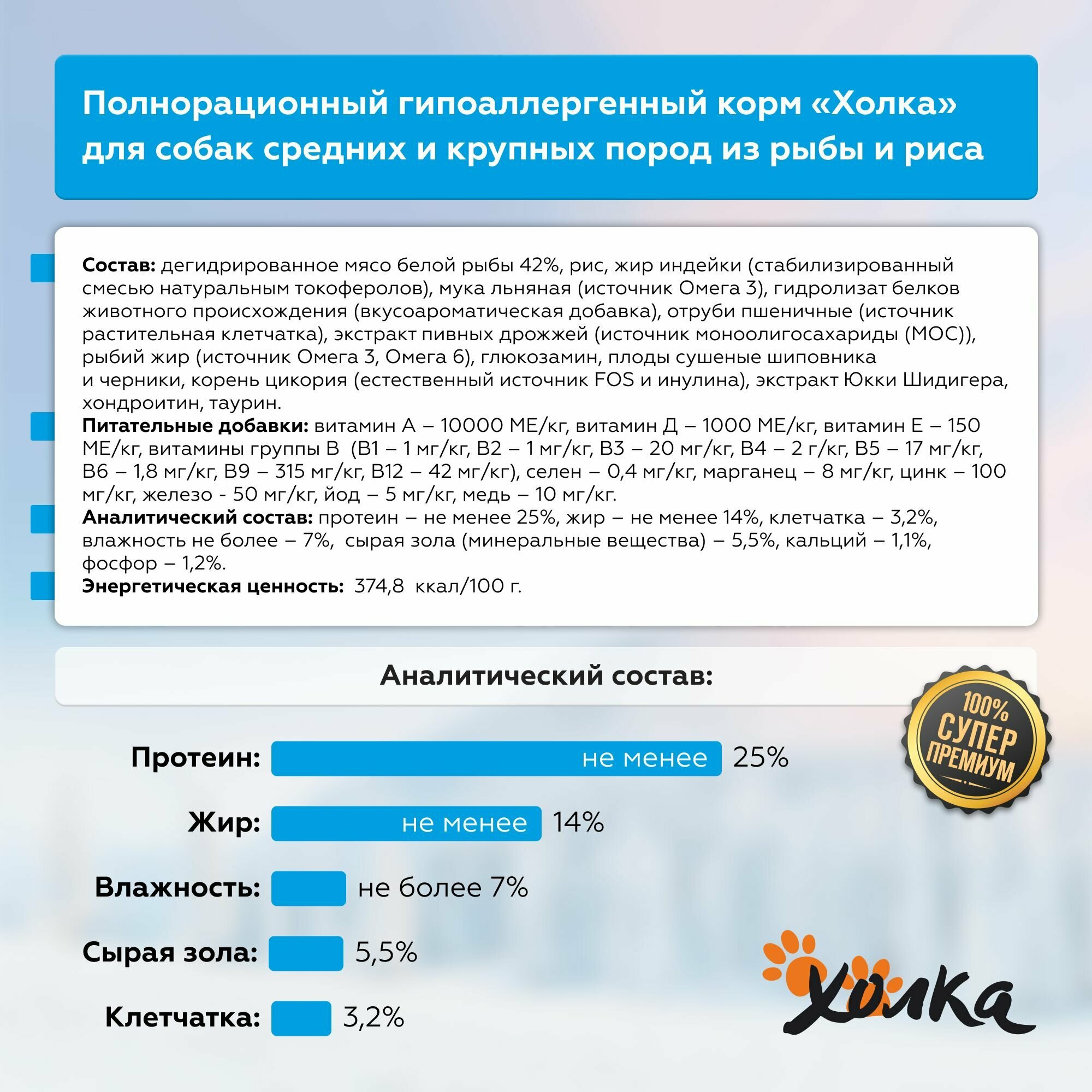 Полнорационный гипоаллергенный корм "Холка" для собак средних и крупных пород из рыбы и риса 15кг информация: