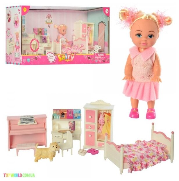 | Комплектация | - кукла; - пианино со звуковым эффектом; - кровать; - шкаф; - стол; - стул 2 шт.; - обувь, одежда; - собака. |