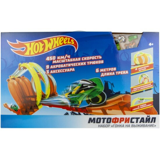 | Комплектация | мини-байк - 2 штуки, мини-трамплин - 3 штуки, прямой сегмент - 6 штук, малая петля - 6 штук, перевернутый сегмент - 2 штуки, У-образный сегмент - 1 штука, большая петля - 1 штука, направляющий модуль - 2 штуки, соединяющий модуль - 1 штука |
