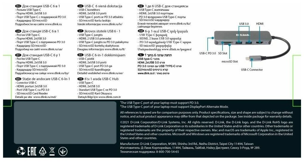 Док-станция D-Link DUB-2327/A1A с разъемом USB Type-C, 2 портами USB 3.0, 1 портом USB Type-C/PD 3.0, 1 портом HDMI и слотами для карт SD и microSD информация: