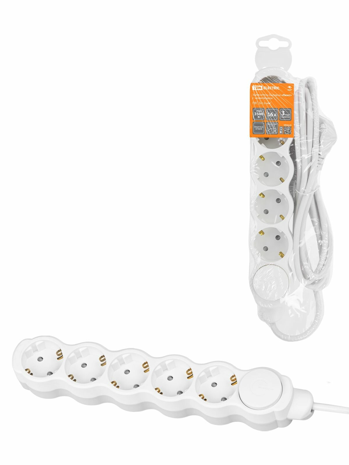 TDM SQ1303-0136 Удлинитель бытовой "Люкс" Ул05в выкл, 5 гнезд, 1,5м, с/з, с з/ш, ПВС 3х1мм2 16А/250В .