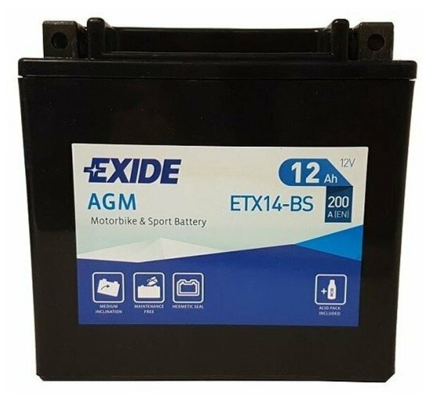 Отзывы на Аккумуляторная батарея прямая полярность 12ah 200a 152/88/147 moto Exide ETX14BS