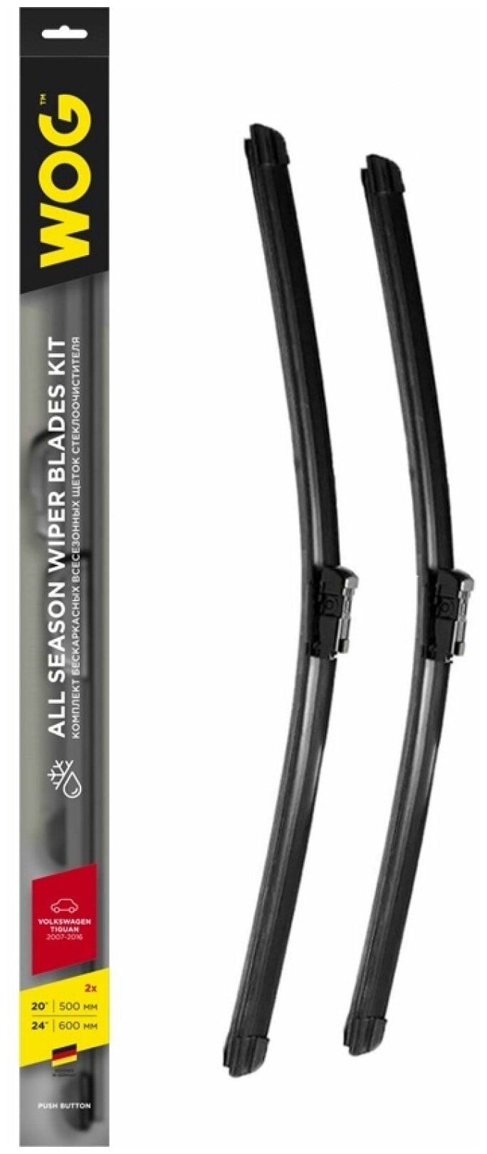 Комплект щеток стеклоочистителя, дворники автомобильные бескаркасные 600 мм/24"+500 мм/20" (Volkswagen TIGUAN) с креплением "Push Button 19 мм" WOG, 2 шт.