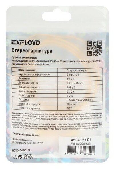 Наушники Exployd EX-HP-1371, вакуумные, 108 дБ, 32 Ом, 3.5 мм, 1.2 м, желтые информация: