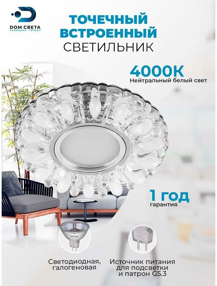 Светильник потолочный встраиваемый со светодиодной подсветкой 15LED*2835 SMD 4000K, MR16 50W G5.3, прозрачный-матовый, хром, CD914 с драйвером в комплекте