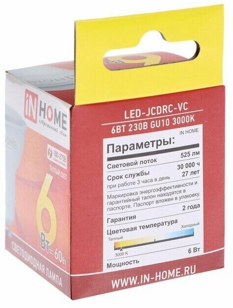 Лампа светодиодная IN HOME LED JCDRC VC, GU10, 6 Вт, 230 В, 3000 К, 525 Лм информация: