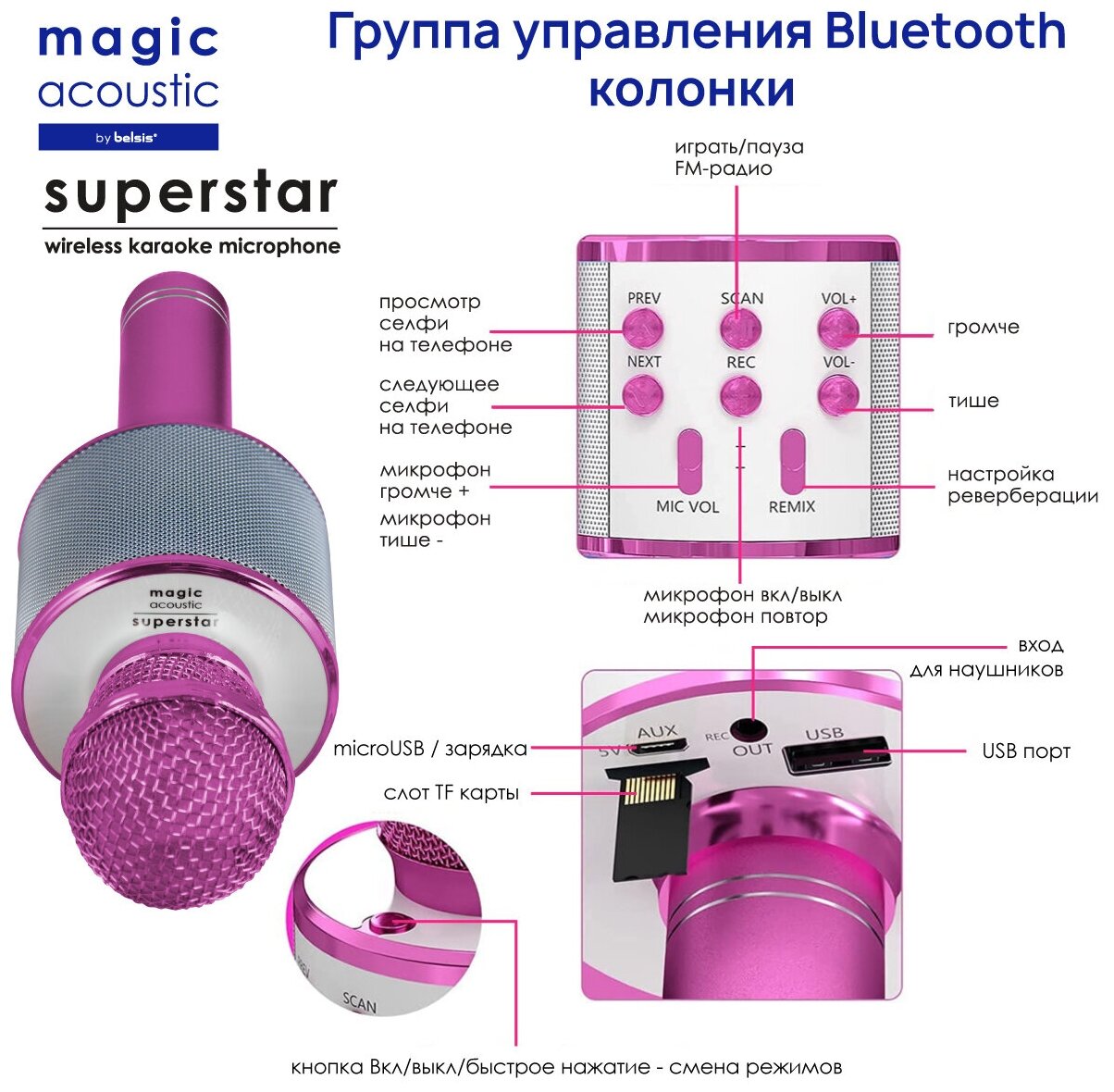 Караоке Микрофон Блютуз Magic Acoustic Superstar/Bluetooth микрофон для Девочек Мальчиков Взрослых/Караоке 3-в-1/MA3001PK Superstar, розовый информация: