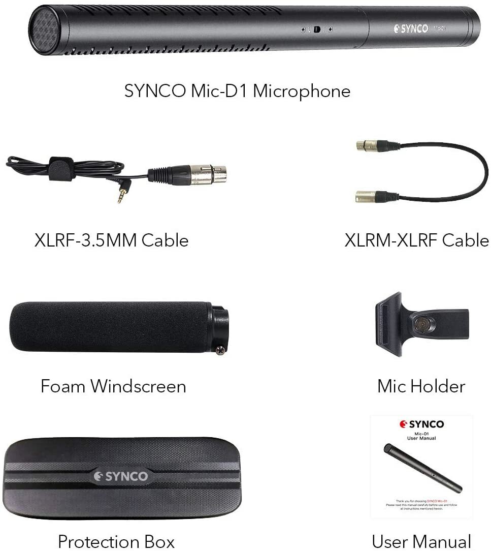 | Подробная комплектация | XLRF-3.5ММ кабель, XLRM-XLRF кабель, ветрозащита, держатель для микрофона, кейс, мануал, микрофон SYNCO Mic-D1 |