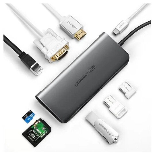 Хаб (разветвитель) Ugreen 10 в 1, 3 x USB 3.0, HDMI, VGA, RJ45, SD/TF, Jack 3,5 mm, PD 6 620 ₽