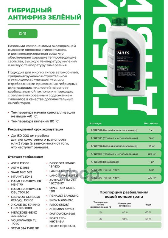 Антифриз G11 MILES концентрат 5кг (зеленый) информация: