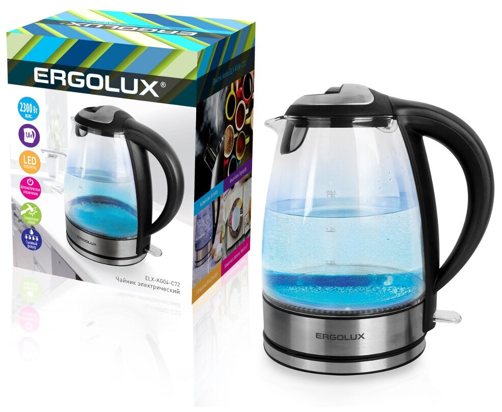 10 цен на Camelion Ergolux ELX-KG04-C72 черный и нерж.сталь (чайник стеклянный, 1.8л, 160-250В, 1500-2300Вт)