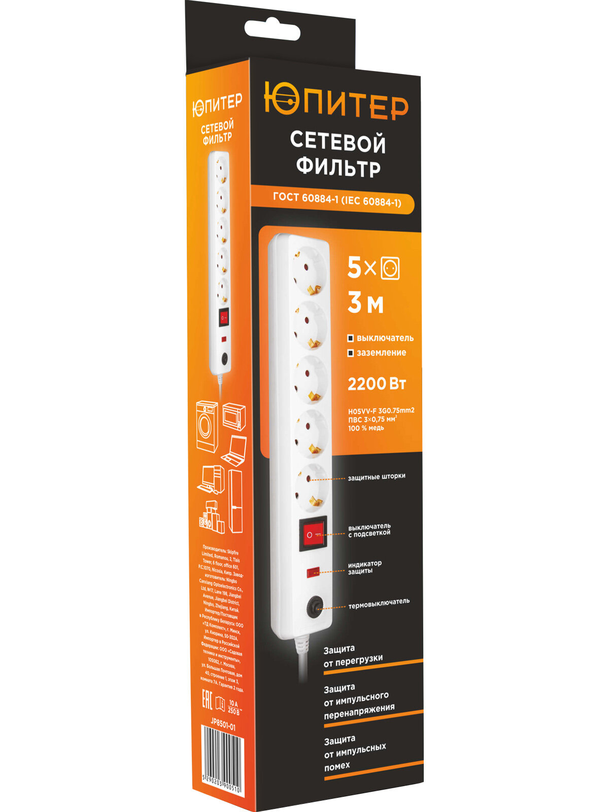 Сетевой фильтр 3 м 5 розеток 2,2 кВт белый юпитер (JP8501-01) информация: