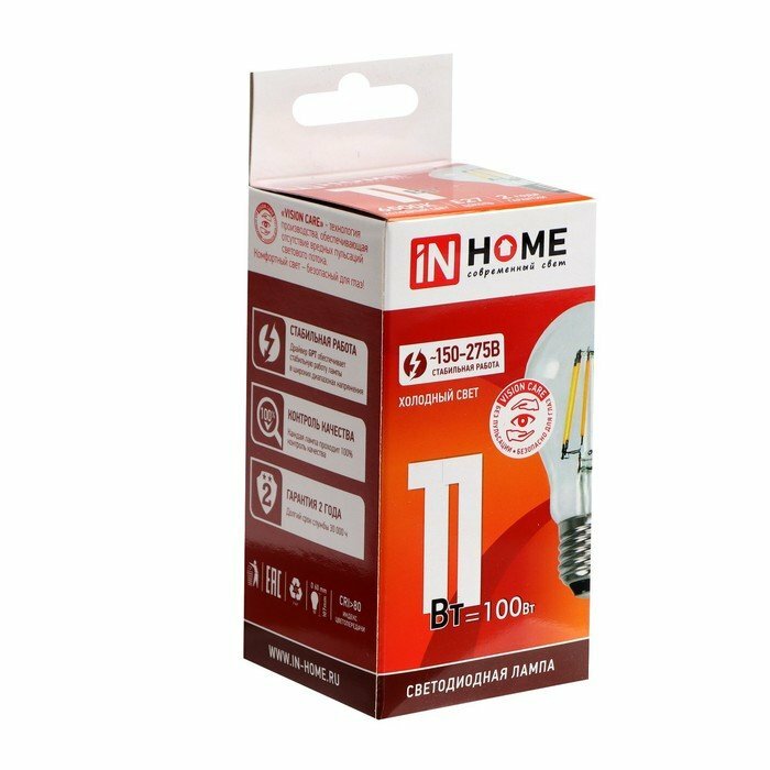 Светодиодная лампа IN HOME LED-A60-deco 11Вт 230В Е27 6500К 990Лм прозрачная 4690612026169