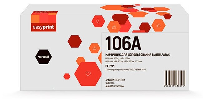 Картридж EasyPrint LH-W1106AL для HP Laser 107a/107r/107w/MFP135a/135r/135w/137fnw (2500 стр.) черный, с чипом 1 540 ₽