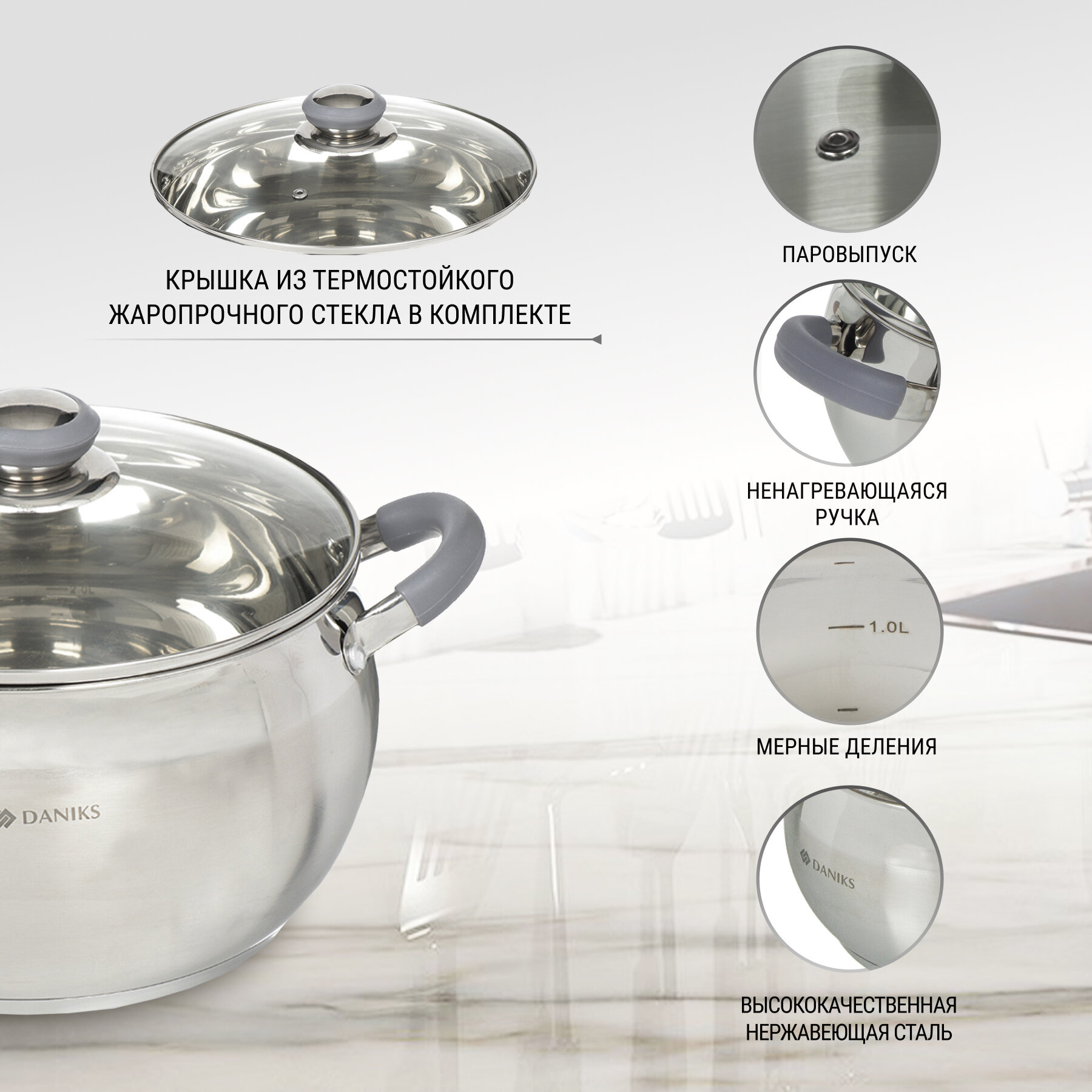 Кастрюля нержавеющая сталь, 1.6 л, с крыш, Daniks
