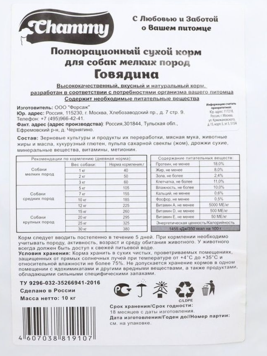 Сухой корм Chammy для собак мелких пород, с говядиной, 10 кг информация: