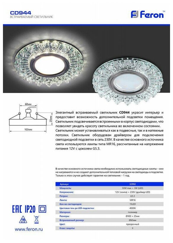Светильник Feron Светильник встраиваемый с подсветкой 4000K, MR16 50W G5.3, прозрачный, хром, CD944 Feron, 32992, GU5.3, 50 Вт, цвет арматуры: хром, цвет плафона: бесцветный