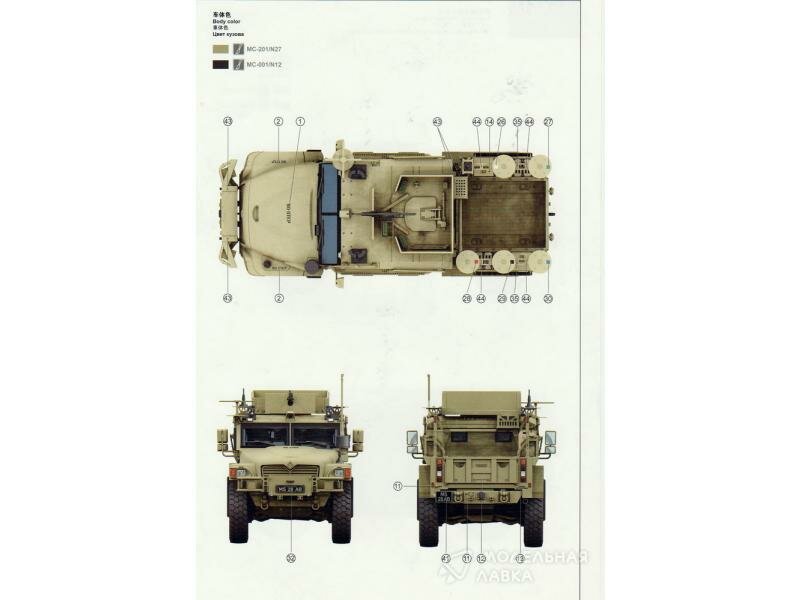 | Дополнительная информация | реалистичная копия; ветровые стекла представлены двухслойными прозрачными деталями; передние колеса поворачиваются, как и оружейная станция на крыше; клей и краски в набор не входят |