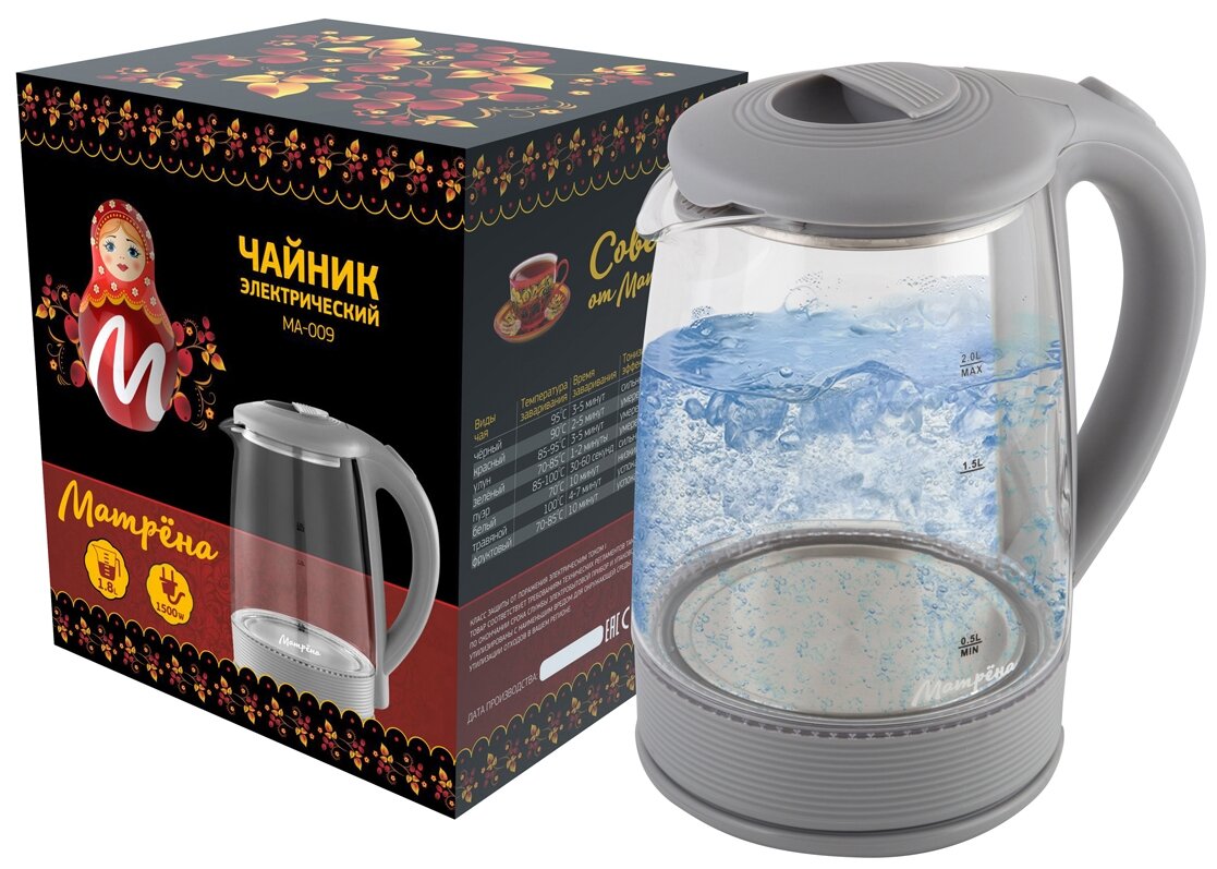 Матрёна Чайник электрический "матрёна" MA-009, стекло, 2 л, 1500 Вт, серый