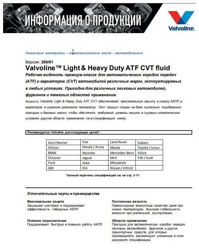 Масло трансмиссионное VALVOLINE Light & Heavy Duty ATF/CVT, 5 л информация: