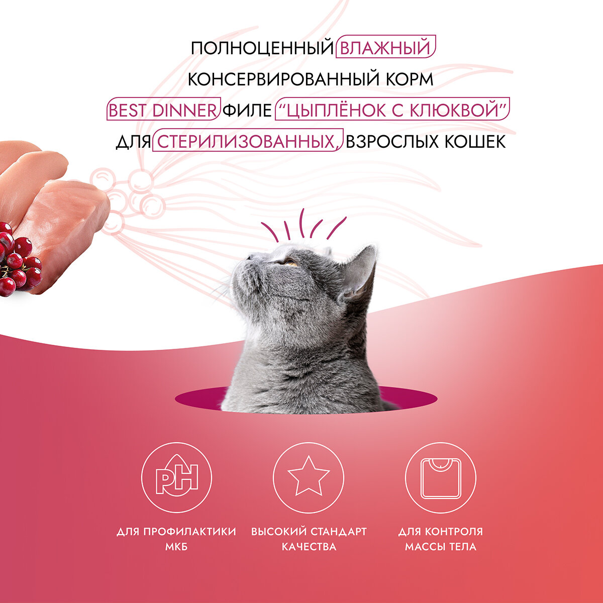 Отзывы на Паучи Best Dinner Holistic Бест Диннер Цыпленок с клюквой для кастрированных и стерилизованных кошек филе в соусе, 18шт по 70г